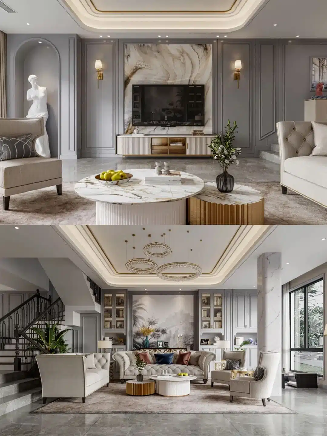 藍灰牆面,金色點綴,雙眼皮吊頂,溫柔舒適